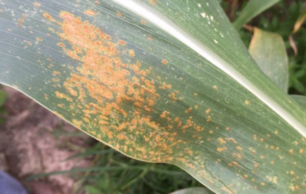 อาการของโรคจะเกิดได้แทบทุกส่วนของต้นข้าวโพด คือ ใบ ลำต้น กาบใบ ฝัก ช่อดอกตัวผู้ โดยแสดงอาการเป็นจุดนูนเล็กๆ สีน้ำตาลแดง ขนาดของแผลประมาณ 0.2-2.0 ม.ม. แผลจะเกิดด้านบนใบมากกว่าด้านล่างของใบ เมื่อเป็นโรคในระยะแรกๆ จะพบเป็นจุดนูนเล็กๆ ต่อมาแผลจะแตกออกมองเห็นเป็นผงสีสนิมเหล็กในกรณีที่เป็นโรครุนแรงจะทำให้ใบแห้งตายในที่สุด